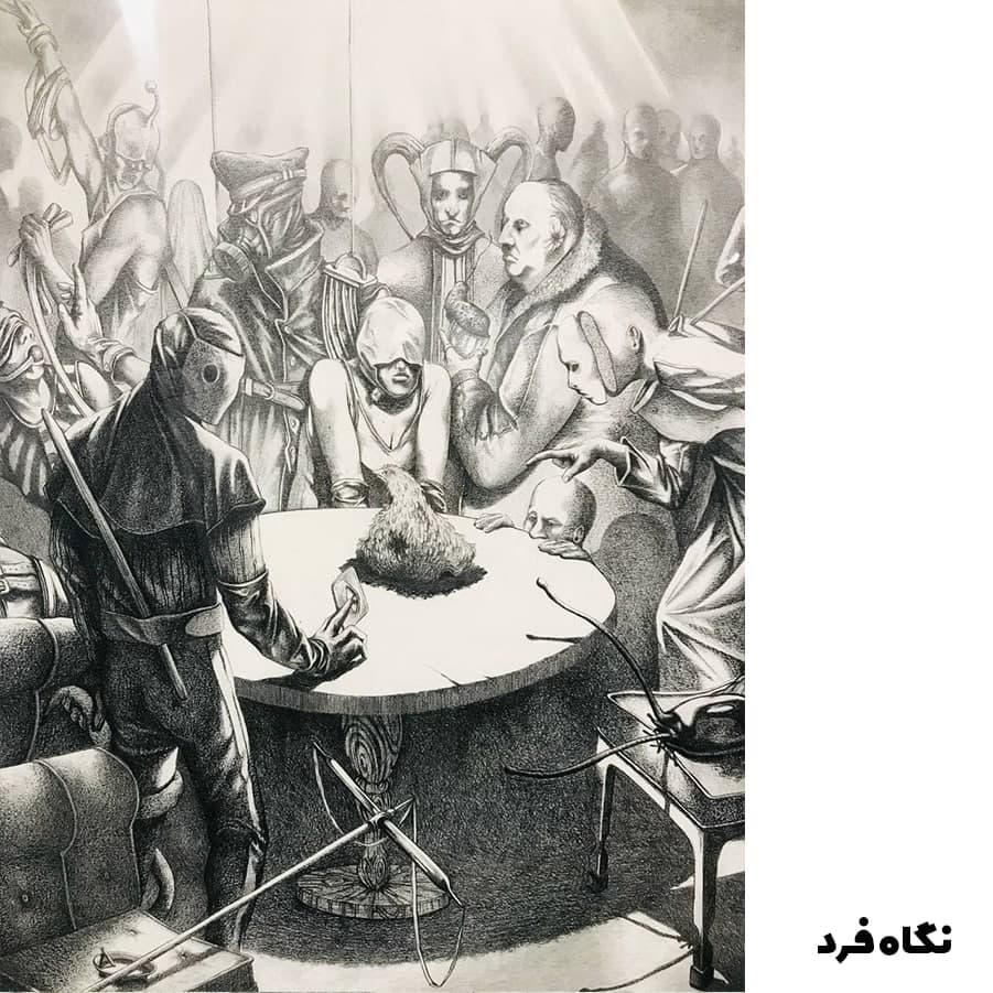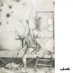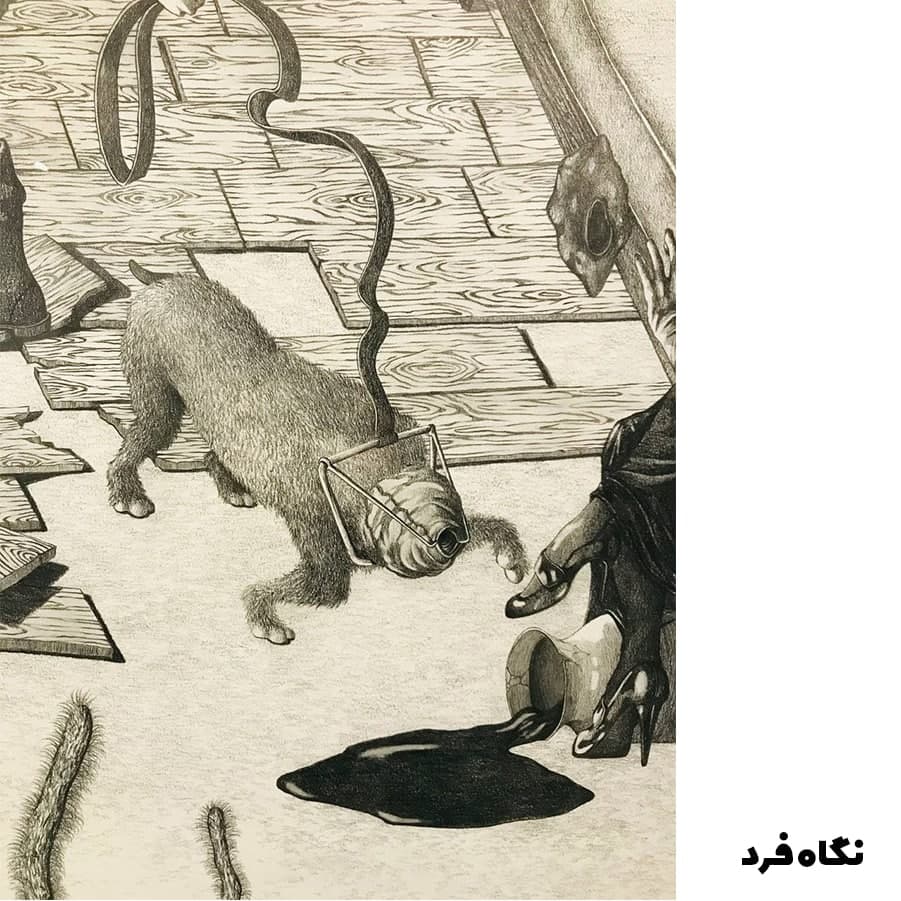 فیگورهایی با بینی‌های دراز یا گوش‌های خرگوشی از اولین چیزهایی است که جلب توجه می‌کند. وقتی پیام توضیح می‌دهد که رمان آئورا فوئنتس یا کله­ پاک‌کن لینچ جرقه‏‏‌های اولیه‌ی این مجموعه را در ذهنش زده‌اند، گره‌ای از ذهنم باز می­‌شود. به یاد مرد جهنده[1] می‌افتم که در قله‌­های دوقلو[2] بود یا خرگوش‌­ها[3] یا شاید دانی دارکو[4]. حتی خرگوشی که پیرزن زندانی‌اش کرده بود و قرار بود همیشه یادآور آئورای زیبا باشد. به یاد می‌آورم فضای تاریک رمان که همه چیز را مبهم می‌کرد مجبورت می‌کرد از همه‌ی حواس پنج گانه‌ات استفاده کنی حتی مجبور می‌شدی نرمی و سختی اشیا را مجسم کنی. حال می‌فهمم چرا نقاشی­ ها سیاه و سفیدند و یا چرا در نقاشی‌ها با این حجم گوناگون از جنسیت اشیا مواجه می‌شویم. همان حس‌هایی که مجبور بودم به کمک واژگانی که می‌شنیدم در ذهنم بازسازیشان کنم، اکنون با دیدن نقاشی‌ها بازسازی می‌شوند. صادقانه بگویم نقاشی‌ها خیلی بهتر از عهده‌ی این بازسازی/انتقال برآمده‌­اند و صد البته که شنیدن کی بود مانند دیدن.