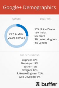 • ۷۳% از کاربران گوگل پلاس مرد هستند و این نشان می دهد این شبکه در بین سایر رسانه های اجتماعی بالاترین تعداد کاربر مرد را دارد.