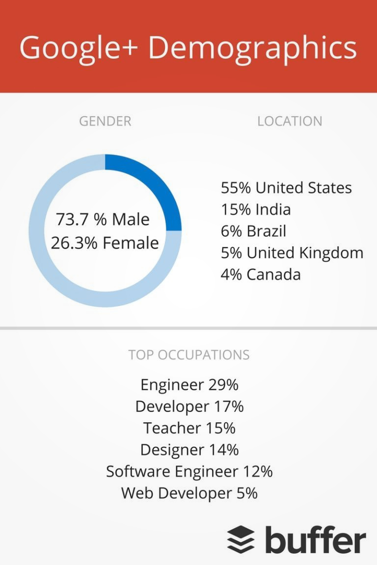 • همچنین بر اساس آمار مربوط به رده بندی کاربران بر اساس شغل، حدود ۷۸% کاربران گوگل پلاس شغل مرتبط با فناوری دارند.